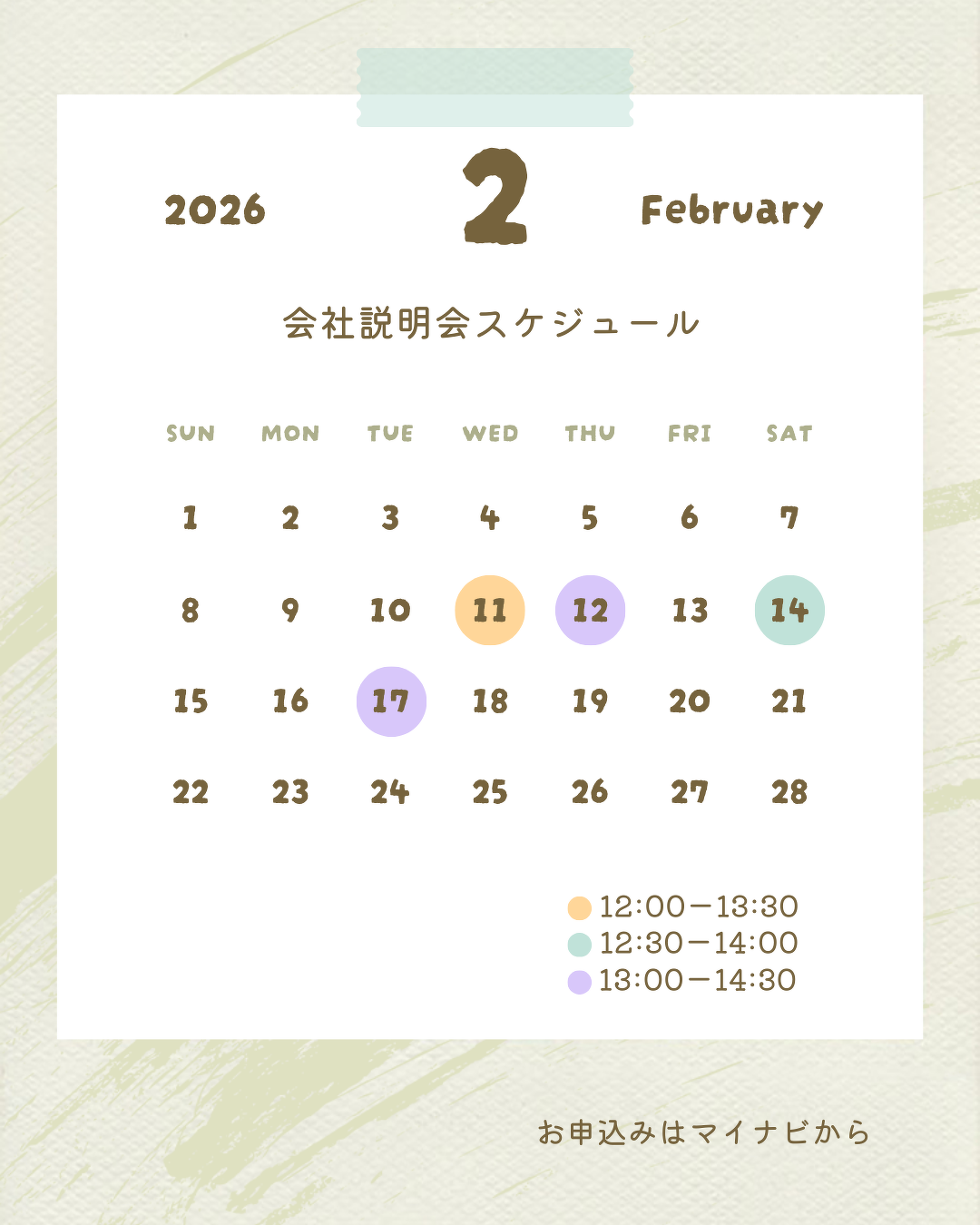 以下のリンク マイナビサイトよりご希望の日程を選択いただくか、弊社HP【お問い合わせ】からご予約をお願いします。